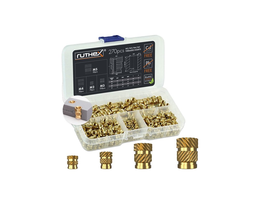 Sada závitových vložiek Ruthex obsahuje 70 kusov RX-M2x4 + 100 kusov RX-M3x5,7 + 50 kusov RX-M4x8,1 + 50 kusov RX-M5x9,5 s vnútornými závitmi M2, M3, M4 a M5. Závitové vložky sa dodávajú v praktickej sade. Závitové vložky sa môžu vkladať pomocou ultrazvuku a tepelného odvodu.